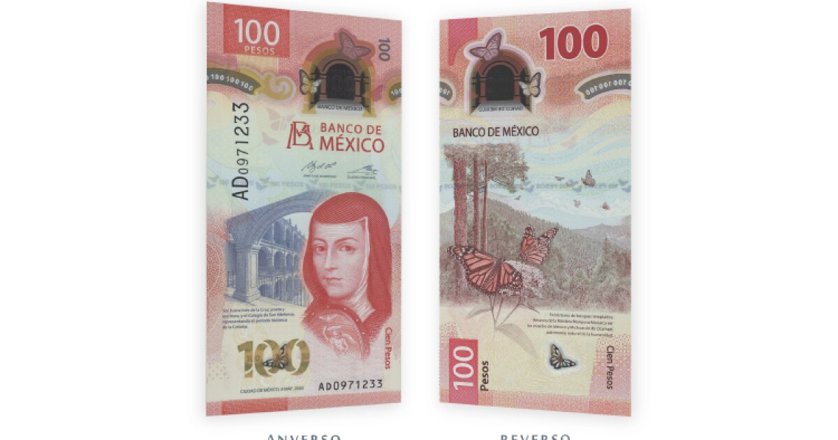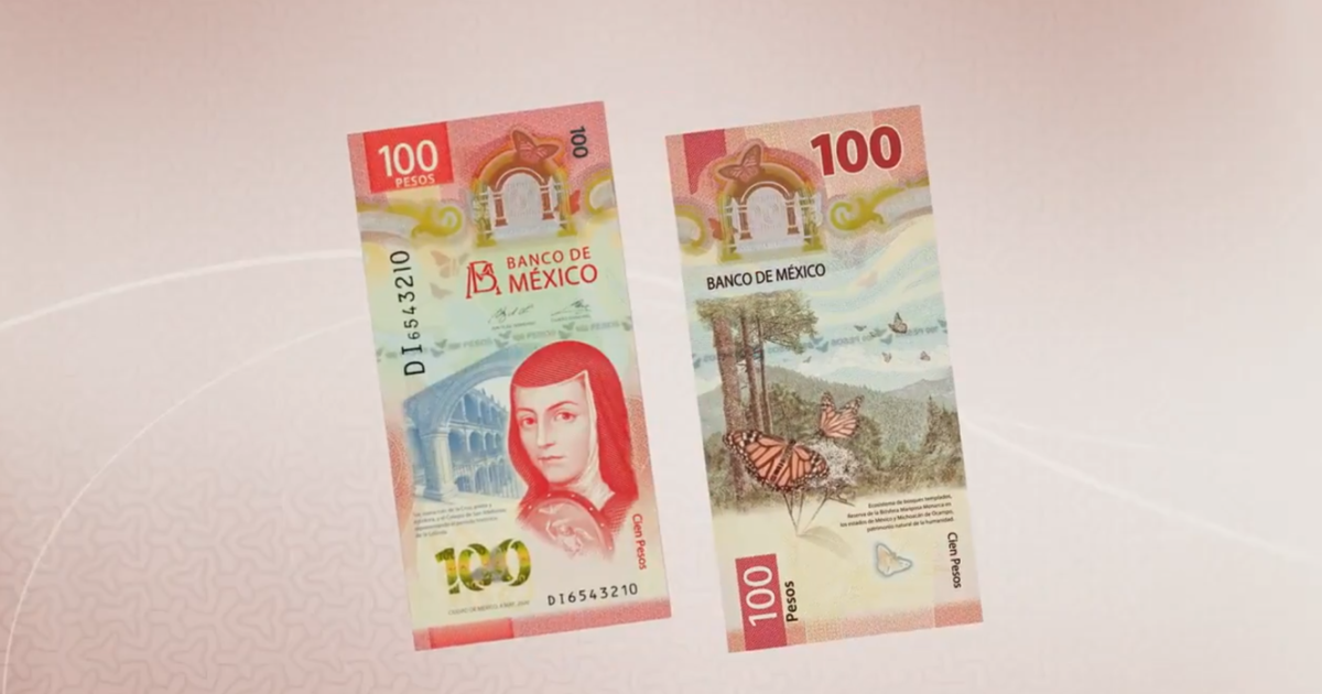 El nuevo billete de 100 pesos tiene un diseño vertical y a la decima musa en el frente mientras que en el reverso se ilustra con los bosques templados y la mariposa monarca.